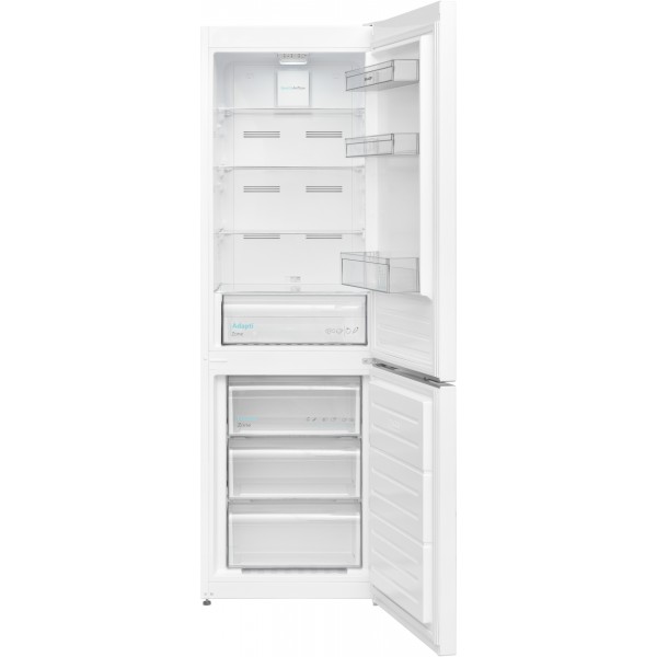 Frigorífico combinado libre instalación con tecnología Advanced No Frost, capacidad total 295 L (frigorífico 207 L, congelador 88 L), control electrónico interior, dimensiones 60x60x186 cm, clase energética E, nivel sonoro 39 dB, Gentle Air Flow para mejor distribución del frío, cajón AdaptiZone polivalente con control de humedad y zona 0°C, puerta reversible con apertura Zero Clearance, diseño de tirador integrado, sistema Odor Free para neutralización de olores.