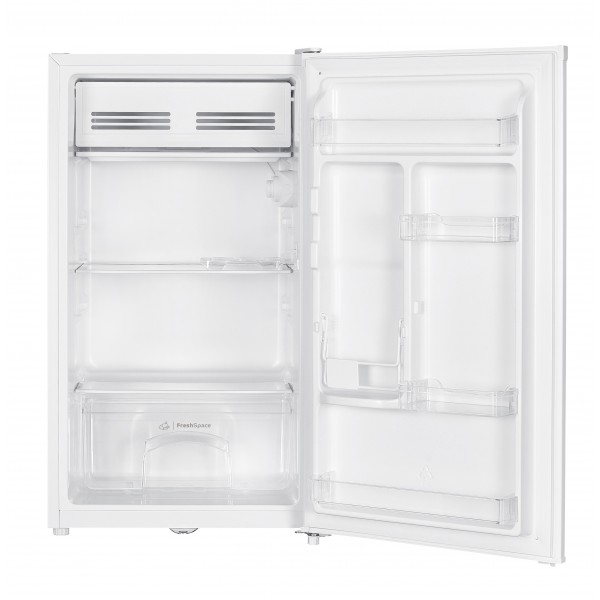 Frigorífico Indesit de libre instalación SIN CONGELADOR, 1 puerta, acabado en color blanco, dimensiones compactas 85 x 47,5 x 44,5 cm ideales para cocinas pequeñas, estudios u oficinas, volumen total 90 L para conservación de alimentos frescos, control mecánico mediante mando giratorio con temperatura regulable, descongelación automática en el compartimento frigorífico, 3 estantes interiores (2 regulables) en cristal de alta resistencia, cajón inferior para frutas y verduras, puerta con bisagra a la derecha reversible para facilitar la integración, bajo nivel sonoro de 39 dB, clase climática templada/subtropical y eficiencia energética E con consumo anual de 85 kWh.