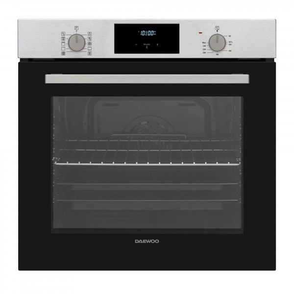 Horno multifunción Daewoo BO7HD51MXNMES encastrable de 60 cm con gran capacidad de 78 litros, 10 funciones de cocción incluyendo turbo, panel de control con temporizador de toque digital extendido, acabado panel inox, rango de temperatura ajustable, múltiples niveles para bandejas, apto para encastre estándar de 60 cm de ancho, ideal para cocina moderna con amplias prestaciones de cocción.