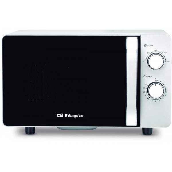 Microondas Orbegozo MI 2060 CE, capacidad de 20 litros, tecnología Flatbed de base lisa fácil de limpiar, interior cerámico, sin plato giratorio (apto para platos cuadrados), potencia microondas 700W, temporizador 35 minutos, 5 niveles de potencia, luz interior LED, función de descongelado, señal de fin de cocción, dimensiones externas 440x280x365 mm, internas 305x200x320 mm, peso neto 10,6 kg, uso versátil y compacto para cocina moderna.
