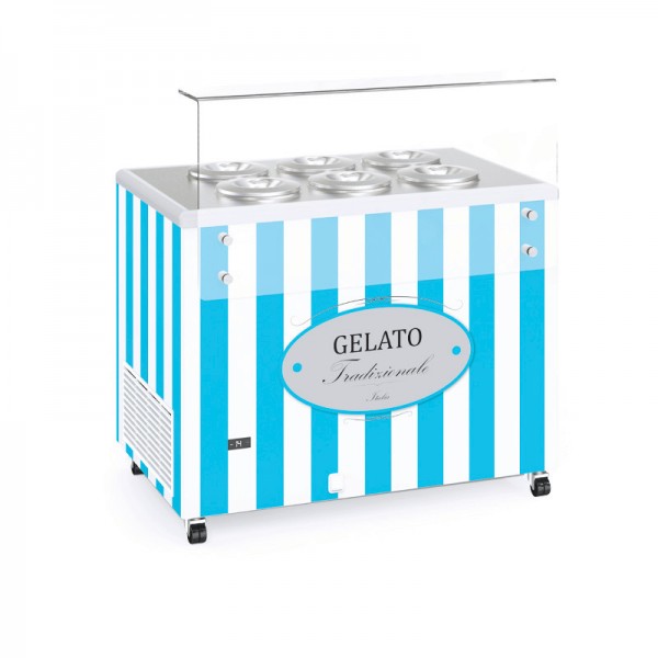 Vitrina expositor para helados profesional con sistema de refrigeración ventilada, volumen útil de 256 litros y rango de temperatura regulable de -22°C a -9°C, clase de temperatura L2 (-18ºC). Equipada con 6 tapas de acceso, tanque doble con reserva, capacidad para 10 cubetas opcionales, y controlador electrónico con sistema de alarma. Clasificación energética B con consumo de 4,8 kWh/24h (1752 kWh/año), refrigerante ecológico R600a, potencia de 135W y nivel de ruido de 54 dB(A). Incluye 4 ruedas con 2 frenos para movilidad, lavaporcionador, desagüe frontal, marco gris con frente de acrílico personalizable (altura con acrílico 1170 mm), y aislamiento de 70 mm. Dimensiones 1063 x 894 x 670 mm (Ancho x Alto x Profundidad), peso neto 54 kg, ideal para puntos de venta y hostelería. ?