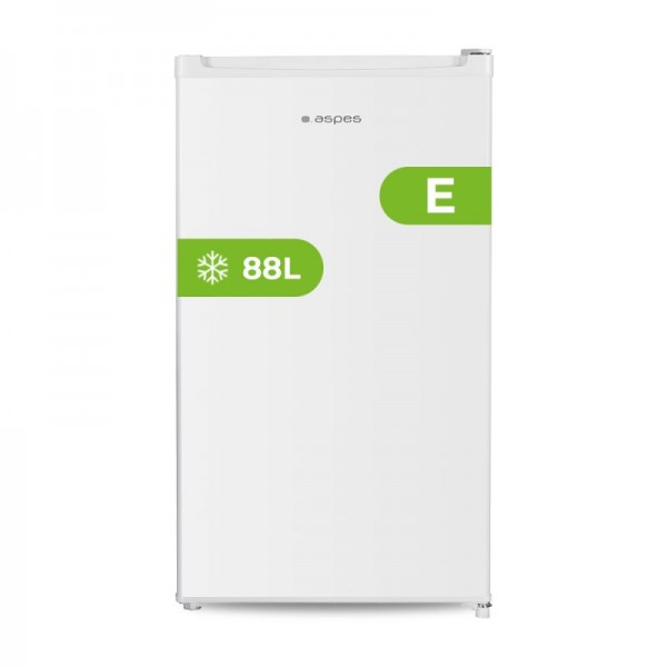 Refrigerador Aspes AR84501E, libre instalación, color blanco, capacidad neta de 88 L, tecnología cíclica con control manual. Dimensiones compactas de 850 x 480 x 450 mm, ideal para espacios reducidos. Clase climática N/ST, eficiencia energética clase E y bajo nivel sonoro de 39 dB. Rango de temperatura entre 0 y 8 ºC, gas refrigerante R600a ecológico. Puerta abatible reversible con apertura por uñero, 2 baldas de cristal, 1 cajón verdulero y 3 balcones en puerta. Consumo energético anual de 85 kWh y potencia de 90 W. Soporte sobre patas.