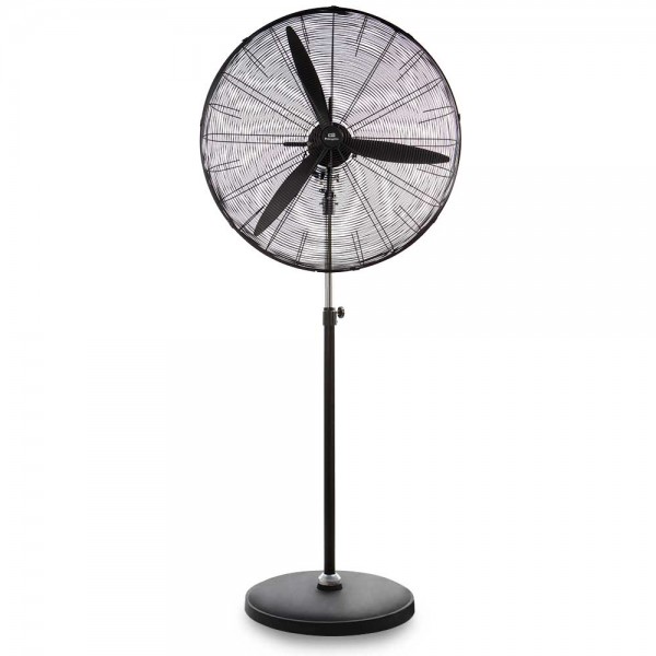 Ventilador de pie industrial Orbegozo PWS 0167, fabricado en hierro fundido, potencia de 180 W y diámetro de aspas de 65 cm. 3 aspas para mayor caudal de aire, 3 velocidades de ventilación, función oscilante y cabezal multiorientable. Altura regulable hasta 1,70 m.