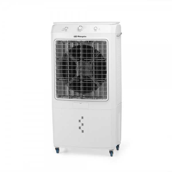 Climatizador evaporativo Orbegozo AIR 5060, sistema 3 en 1 con funciones de climatizador, humidificador y purificador. Potencia de 350 W y gran depósito de 60 litros. Triple cortina de frío, 3 velocidades de ventilación, lamas exteriores direccionales manuales y lamas interiores oscilantes automáticas. Mandos con detalles cromados, ruedas pivotantes con bloqueo e incluye acumuladores de frío. Dimensiones: 60 x 120 x 40 cm (ancho x alto x fondo).