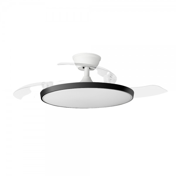 Ventilador de techo retráctil Orbegozo CP154105 con motor DC de bajo consumo y alta eficiencia, potencia de 35 W y diámetro de aspas de 105 cm. 3 aspas retráctiles, 6 velocidades de ventilación, modo brisa y funcionamiento silencioso. Sistema de ventilación reversible con modo invierno y verano. Luz LED de 3 tonos de 36 W, tipo SMD con 3600 lúmenes, temperatura de color regulable de 2700 a 6500 K, brillo variable y modo luz nocturna. Incluye mando a distancia, temporizador programable y dos prolongadores. Altura regulable: 29-41,5 cm.