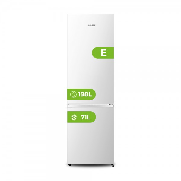 Frigorífico combi Aspes AC185501E, libre instalación, color blanco, tecnología cíclica con control manual y descongelación manual. Capacidad neta total de 269 L, con 198 L en refrigerador y 71 L en congelador de 4 estrellas, temperatura de refrigeración entre 0 y 4 ºC y congelación hasta -18 ºC, capacidad de congelación de 3,2 kg/24h y autonomía de 11 h. Dimensiones de 1800 x 550 x 558 mm, soporte sobre patas y ruedas, eficiencia energética E, nivel sonoro de 39 dB, clase climática N/ST y consumo anual de 210 kWh. Gas refrigerante R600a, luz interior LED, puertas abatibles reversibles con uñero, 4 baldas de cristal, 1 cajón verdulero, 4 balcones en puerta, 1 huevera, 3 cajones en congelador y bandeja de hielo incluida.