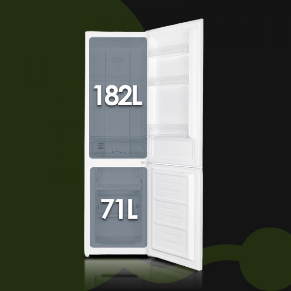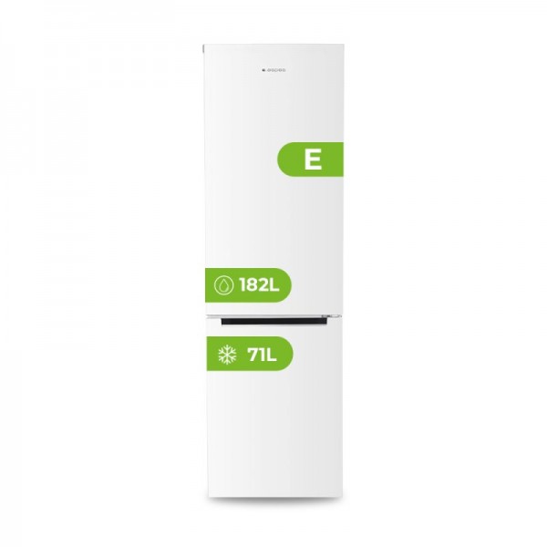 Frigorífico combi Aspes AC185502ENF, libre instalación, color blanco, tecnología No Frost con sistema de ventilación Multi Air Flow y descongelación automática. Capacidad neta total de 253 L, con 182 L en refrigerador y 71 L en congelador de 4 estrellas, temperatura de refrigeración entre 2 y 8 ºC y congelación entre -14 y -22 ºC, capacidad de congelación de 3,2 kg/24h y autonomía de 9,5 h. Dimensiones de 1800 x 540 x 600 mm, soporte sobre patas y ruedas, eficiencia energética E, nivel sonoro de 40 dB, clase climática N/ST, potencia de 110 W y consumo anual de 220 kWh. Gas refrigerante R600a, luz interior LED reemplazable, puertas abatibles reversibles con uñero, 3 baldas de cristal, 1 cajón de control de temperatura, 3 balcones en puerta y 2 cajones en congelador.