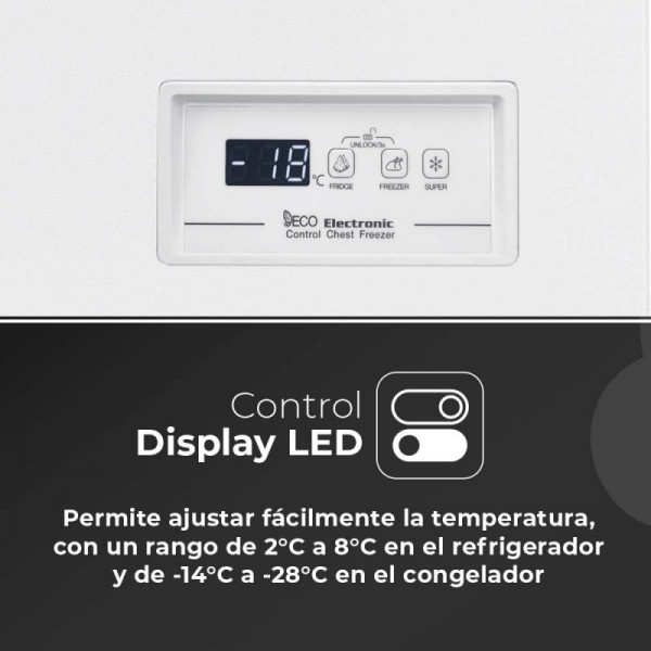 Congelador horizontal Aspes ACH3001EDC, libre instalación, color blanco, tecnología cíclica con sistema Dual Cooling, control mediante display LED exterior y ajuste exacto de temperatura grado a grado. Capacidad neta de 287 L, congelador de 4 estrellas con rango de temperatura entre -14 y -24 ºC, alta capacidad de congelación de 14 kg/24h y excepcional autonomía de 28 h. Dimensiones de 850 x 1090 x 625 mm, soporte sobre ruedas, clase climática SN/N/ST/T, eficiencia energética E, nivel sonoro de 40 dB, potencia de 150 W y consumo anual de 227 kWh. Incluye modo Super congelación, memoria tras apagón, gas refrigerante R600a, descongelación manual, apertura por tirador y 1 cesta incluida.