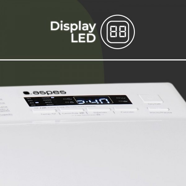 Lavadora carga superior Aspes ALCS8301AI, libre instalación, color blanco, motor Inverter, capacidad de 8 kg y centrifugado máximo de 1300 rpm. Control mediante display LED manual con 16 programas de lavado, función Steam Assist (Vapor), Mi Ciclo (memoria de programa personalizado), prelavado, aclarado extra, selección de temperatura y velocidad de centrifugado, y limpieza de tambor. Tambor de acero inoxidable de 51 L, eficiencia energética A en lavado y B en centrifugado, potencia de 1900 W, consumo en ciclo ECO de 47 kWh/100 ciclos y 48 L/ciclo de agua, sistema Eco-Logic System y control antidesbordamiento. Dimensiones compactas de 875 x 400 x 610 mm, bloqueo de control y protección eléctrica IPX4 incluidos.