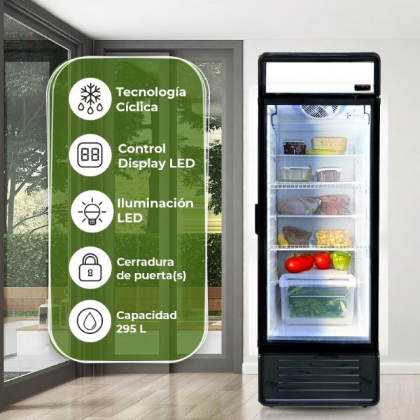 Refrigerador Horeca Aspes ARH185601D, libre instalación, color negro con acabado antihuellas, tecnología cíclica y descongelación automática, diseñado para uso profesional. Capacidad neta total de 295 L, temperatura de refrigeración hasta 10 ºC, control mediante display LED exterior, puerta abatible de cristal con cerradura y marco negro, apertura por uñero. Dimensiones de 1852 x 535 x 601 mm, soporte sobre ruedas y patas niveladoras, clase climática SN/N/ST/T, eficiencia energética D, nivel sonoro de 55 dB, potencia de 280 W y consumo anual de 730 kWh. Gas refrigerante R600a, luz interior LED reemplazable y 4 rejillas incluidas.