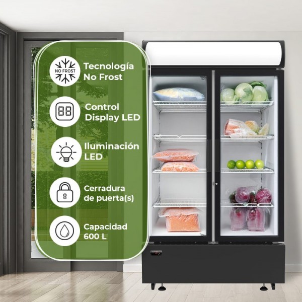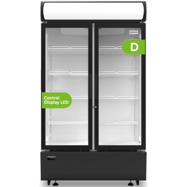Refrigerador Horeca Aspes ARH2101E, libre instalación, color negro con acabado antihuellas, tecnología cíclica ventilada y descongelación automática, diseñado para uso profesional de gran capacidad. Capacidad neta total de 596 L, temperatura de refrigeración entre 1 y 10 ºC, ajuste exacto grado a grado mediante display LED exterior, 2 puertas abatibles de cristal con cerradura, marco negro y apertura por tirador. Dimensiones de 1980 x 990 x 605 mm, soporte sobre ruedas y patas niveladoras, clase climática SN/N/ST/T, eficiencia energética D, nivel sonoro de 64 dB, potencia de 780 W y consumo anual de 2591,5 kWh. Gas refrigerante R290, luz interior LED reemplazable y 4 rejillas incluidas.