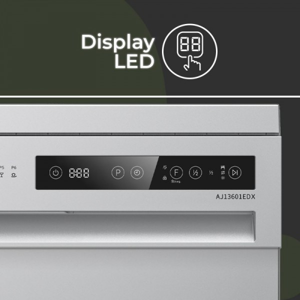 Lavavajillas 60 cm Aspes AJ13601EDX en color inox, capacidad para 14 sets de cubiertos, 2 bandejas con cesta de cubiertos y 2 brazos rociadores, dimensiones 845 x 598 x 590 mm (alto x ancho x fondo). Instalación libre con posibilidad de integración, control por Display LED táctil y secado Residual. Dispone de 6 programas: 80', Cristal, Eco, Estándar/normal, Prelavado y Rápido. Incorpora funciones de Media carga, Stop&Go, lavado extra, intensivo, inicio diferido, compatible con detergente 3&1, indicadores de sal, abrillantador, grifo cerrado, tiempo restante y fin de programa. Potencia 1890 W, eficiencia energética clase E, nivel sonoro 49 dB, dispositivo antiinundación con sensor de agua y bloqueo de control integrados.