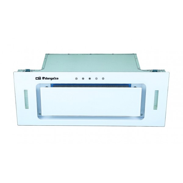 Campana cassette Orbegozo CA12160BL con acabado en cristal templado blanco, motor DC de 75 W y capacidad de extracción de 449,4 m³/h. Clase energética A+, nivel de ruido desde 45 dB, 3 niveles de potencia seleccionables, control digital y táctil, temporizador con auto-apagado a los 5 minutos, iluminación LED de bajo consumo (2 x 1,5 W) y filtro de aluminio desmontable y lavable para fácil limpieza. Dimensiones: 520 x 296 x 307 mm (ancho x alto x profundidad).