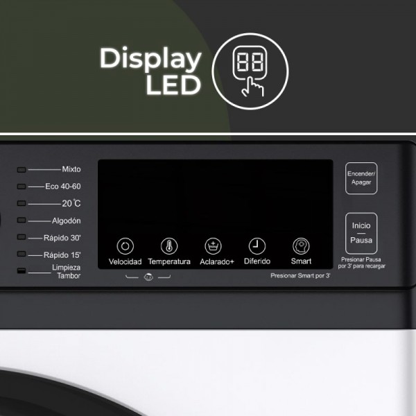Lavadora de carga frontal Aspes AL10400AIDV, 10 kg de capacidad y centrifugado máximo a 1400 rpm, en color blanco con puerta transparente y marco negro. Instalación libre con tapa desmontable, motor Inverter, tambor Diamante de acero inoxidable de 64 L, panel de control Display LED manual con display multifunción y 14 programas de lavado. Incluye programas de Algodón, Algodón 20°C, Antibacteria, Delicado/Lavado a mano, Eco 40-60°C, Lana, Rápido, Vapor (Steam Assist), Aclarado + centrifugado, Centrifugado y Limpieza tambor. Incorpora lavado inteligente, Stop&Go, inicio diferido, aclarado extra, indicador de fases de lavado, selección de temperatura y selección de velocidad de centrifugado. Sistema Eco-Logic System, control antidesbordamiento, anticalentamiento, antibalanceo y antiespuma. Potencia 1600 W, eficiencia energética de lavado clase B y nivel sonoro 72 dB. Dimensiones: 845 x 598 x 520 mm (alto x ancho x fondo).