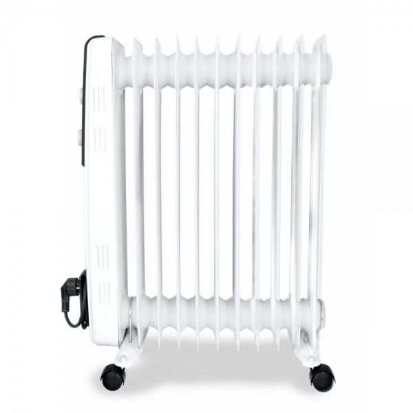 Radiador de aceite con 11 elementos de gran inercia térmica. Tres niveles de potencia: 1000W, 1500W y 2500W. Termostato regulable. Sistema de protección contra sobrecalentamiento. Asa de transporte. Recogecables. Luces LED de funcionamiento. Ruedas pivotantes multidireccionales para fácil desplazamiento.